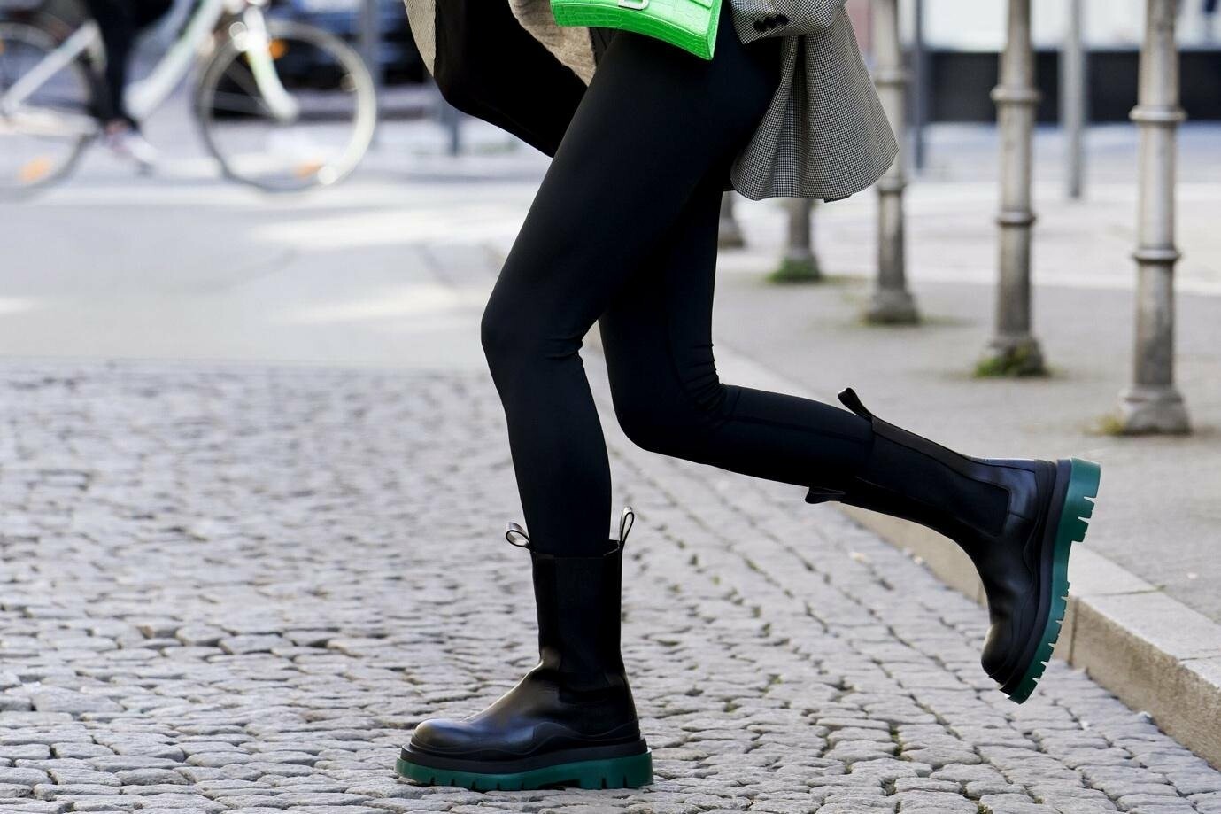 Оптимальным выбором станут высокие ботинки на шнуровке в стиле милитари. Грубая подошва не только добавляет актуальности, но и защищает от холода. Также превосходно смотрятся высокие сапоги-трубы или жокейские сапоги, в которые лосины легко заправляются. Если образ предполагает максимальный комфорт, можно надеть угги или дутики, которые снова вернулись в списки трендов. Главное, чтобы леггинсы плотно облегали ногу и не собирались гармошкой над обувью.