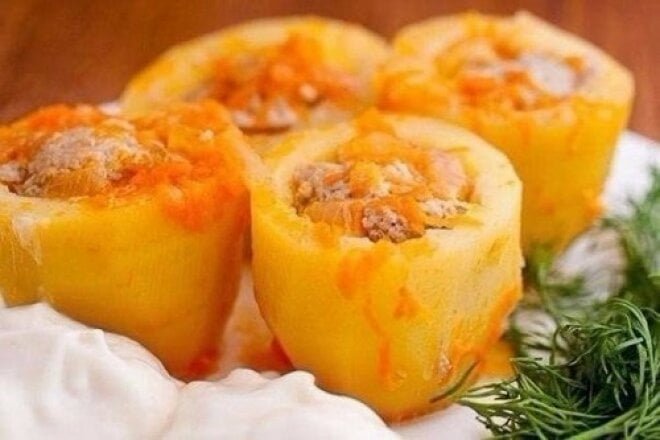 Готову картоплю з фаршем у сметані подавайте гарячою. Перед подачею можна посипати свіжою зеленню (кріп, петрушка). За бажанням додайте салат зі свіжих овочів або соління.