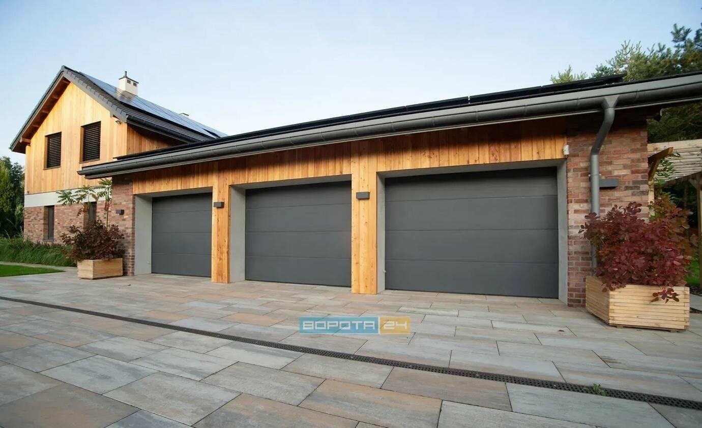 Підйомні системи такого формату мають полотно, що складається з горизонтальних сендвіч-панелей, які рухаються по напрямних і піднімаються під стелю під час відкривання заїзду. Головна перевага конструкції — високий рівень термоізоляції, який вона здатна забезпечувати. Завдяки багатошаровій структурі панелей та контурним ущільнювачам по периметру секційні ворота в гараж ефективно утримують тепло у приміщенні. Вони також забезпечують кращу звукоізоляцію та герметичність. Це особливо важливо для гаражів, які безпосередньо межують із житловими приміщеннями. До сильних сторін варто віднести й підвищену міцність конструкції, широкий вибір дизайнів, можливість інтеграції хвіртки та скління у полотно, а також підключення автоматики. Секційні системи виглядають солідно та підвищують загальну естетику фасаду. Серед недоліків — вища вартість у порівнянні з ролетними моделями, а також необхідність точного монтажу та якісної підготовки прорізу.